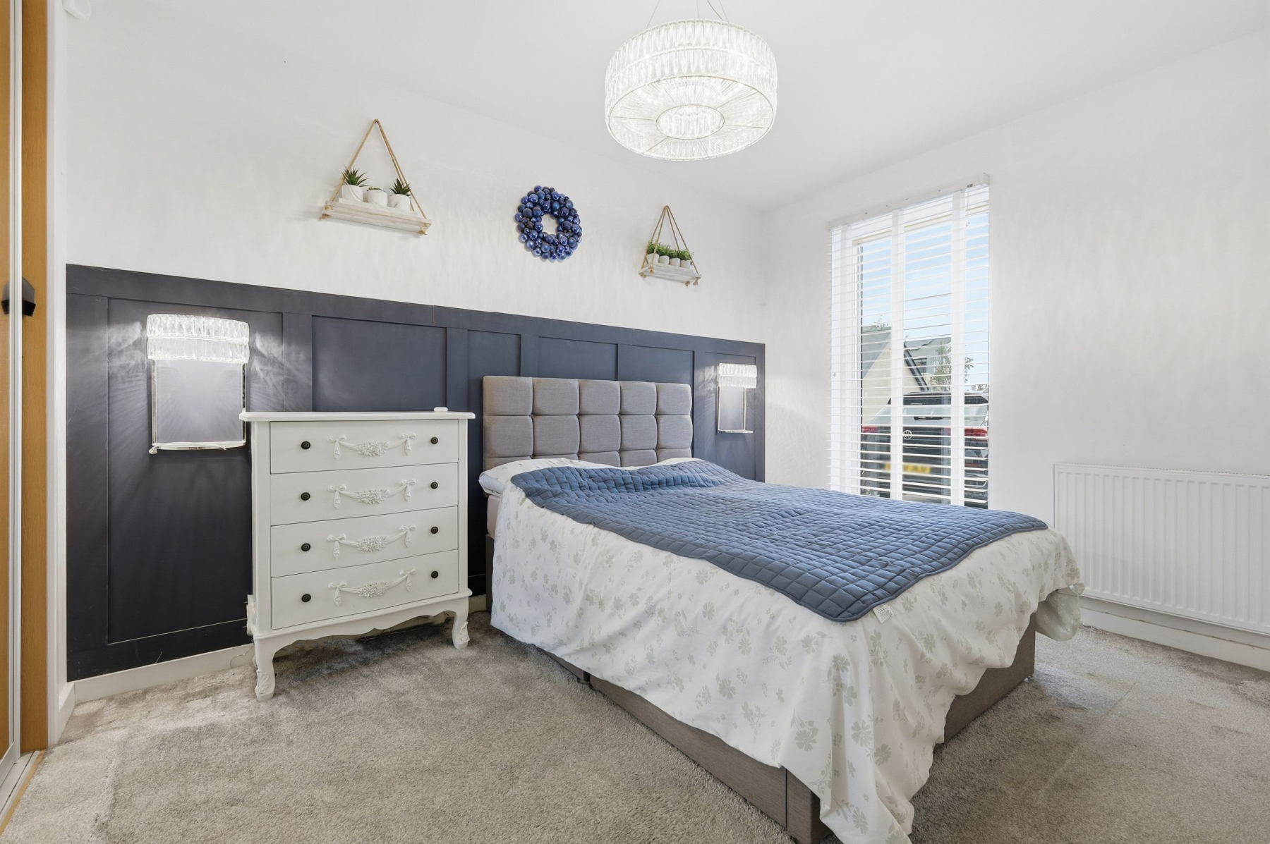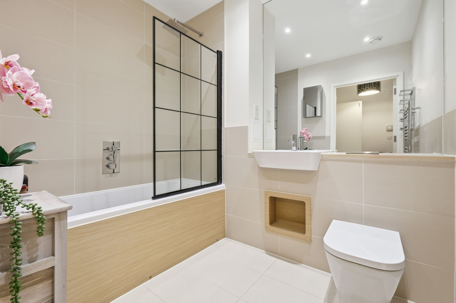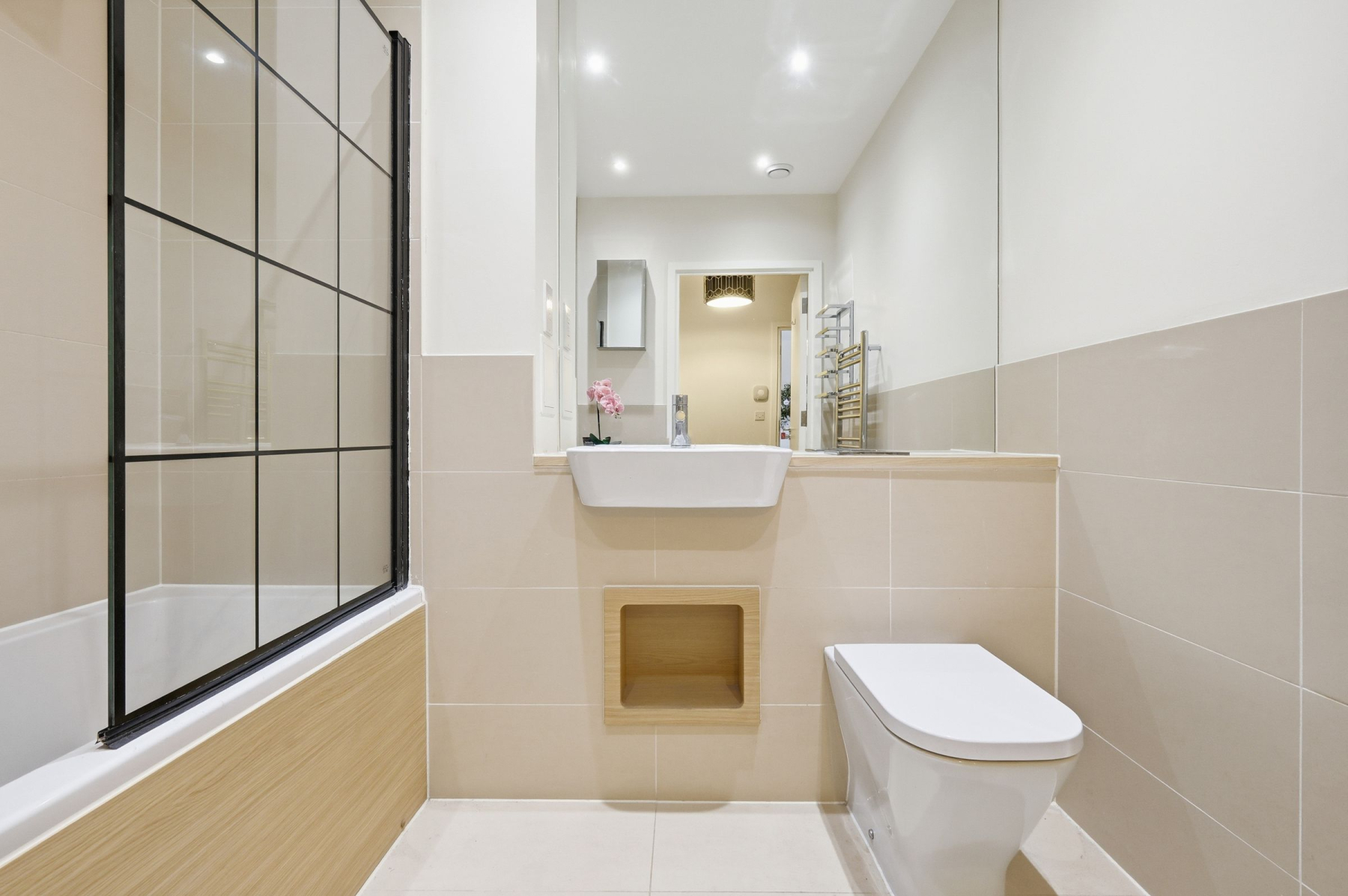 The master bedroom is a haven of tasteful décor, complete with custom-fitted wardrobes for superb, practical storage. The interior is completed by a sleek, recently updated family bathroom featuring a contemporary design, a heated towel rail, and stylish black-panelled glass accents.