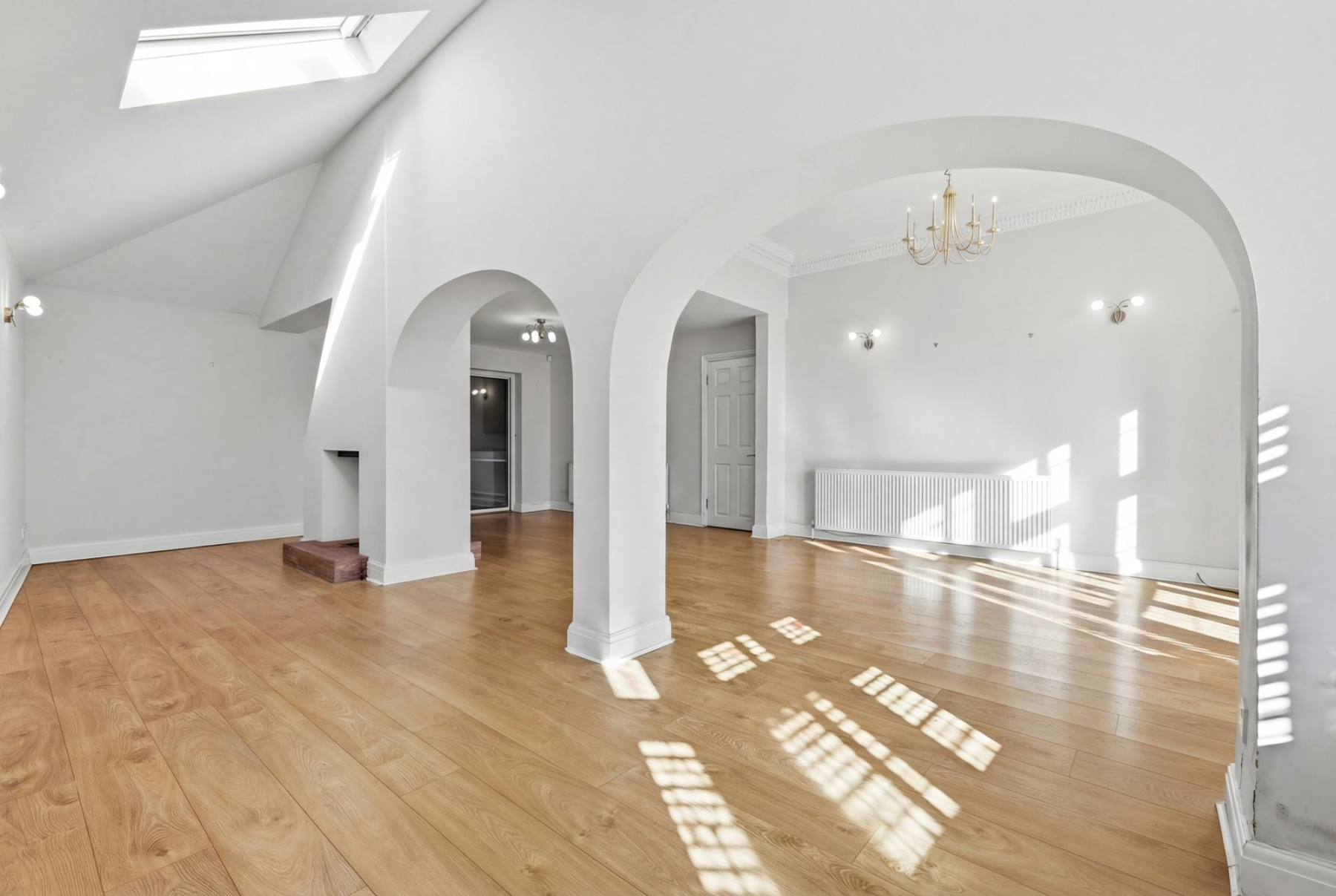Two double glazed bay windows to front, Velux window to flank, radiator, wood flooring, smooth ceiling with cornice coving and ornate ceiling rose, sliding doors to: