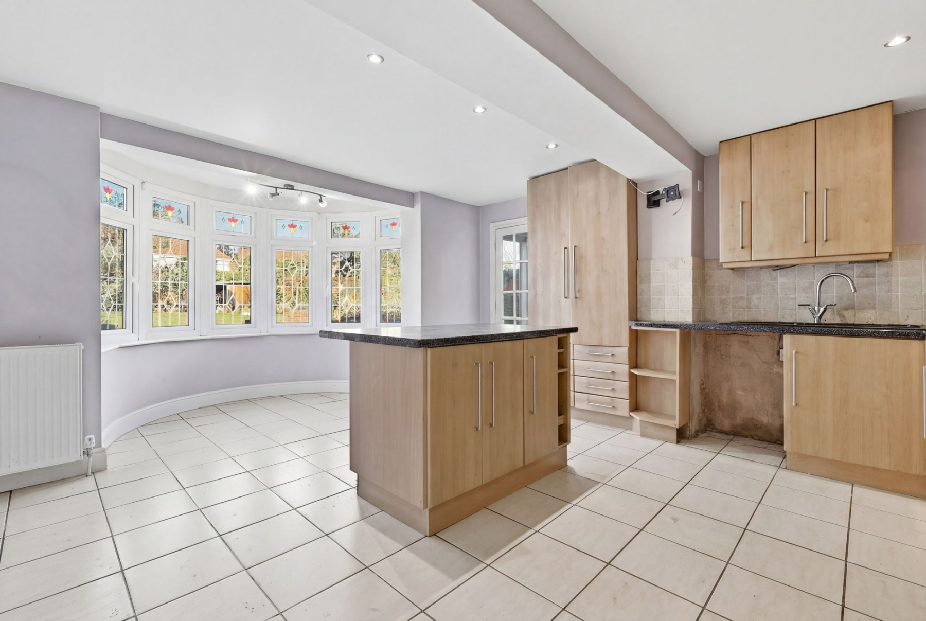 Double glazed bay window to rear, range of base level units and drawer with work surfaces over, inset sink drainer unit with mixer tap, range of integrated appliances, range of matching eye level cupboards, two radiators, tiled flooring, complementary tiling, smooth ceiling with inset spotlights. Centre island housing: range of base level units with work surface over. Door to: