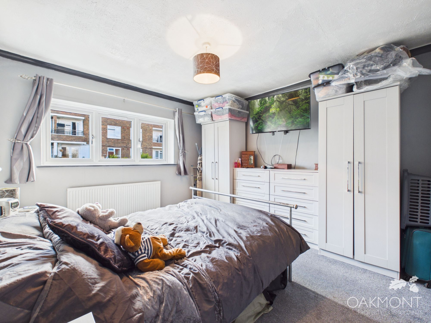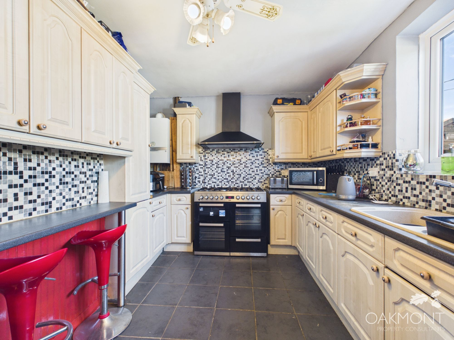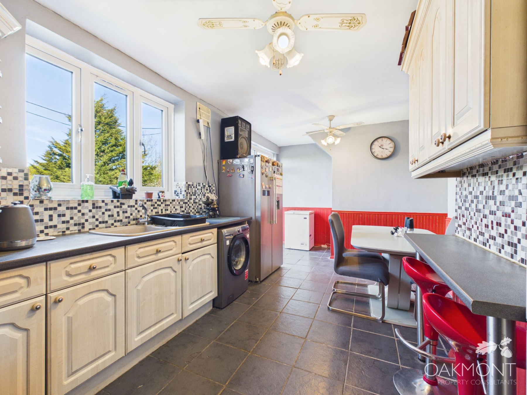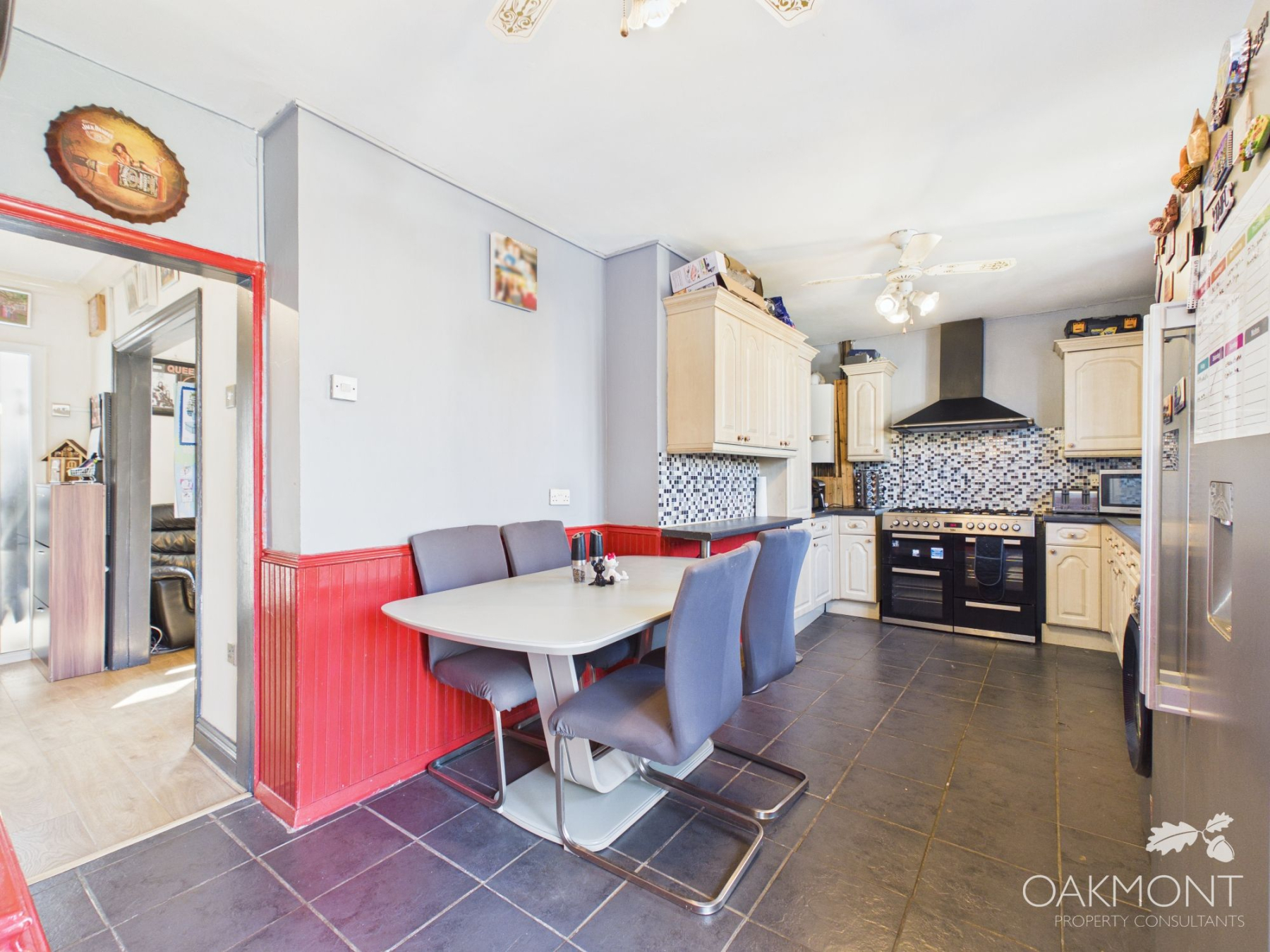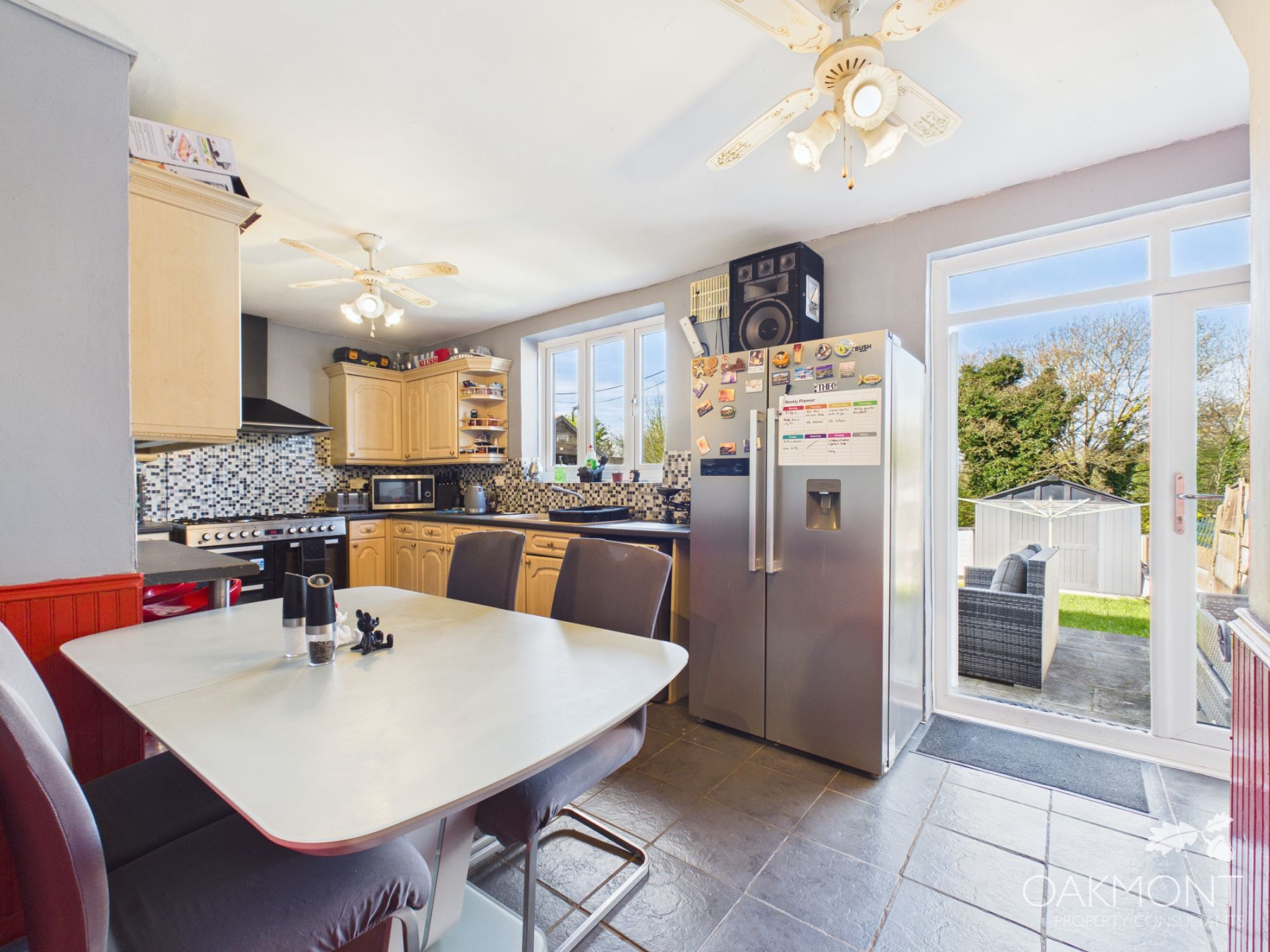 The kitchen diner is a good sized with ample base and eye level units, work top space, space for a range cooker, small dining table and chairs, additional storage cupboard, patio doors leading to the garden and windows to the rear.
