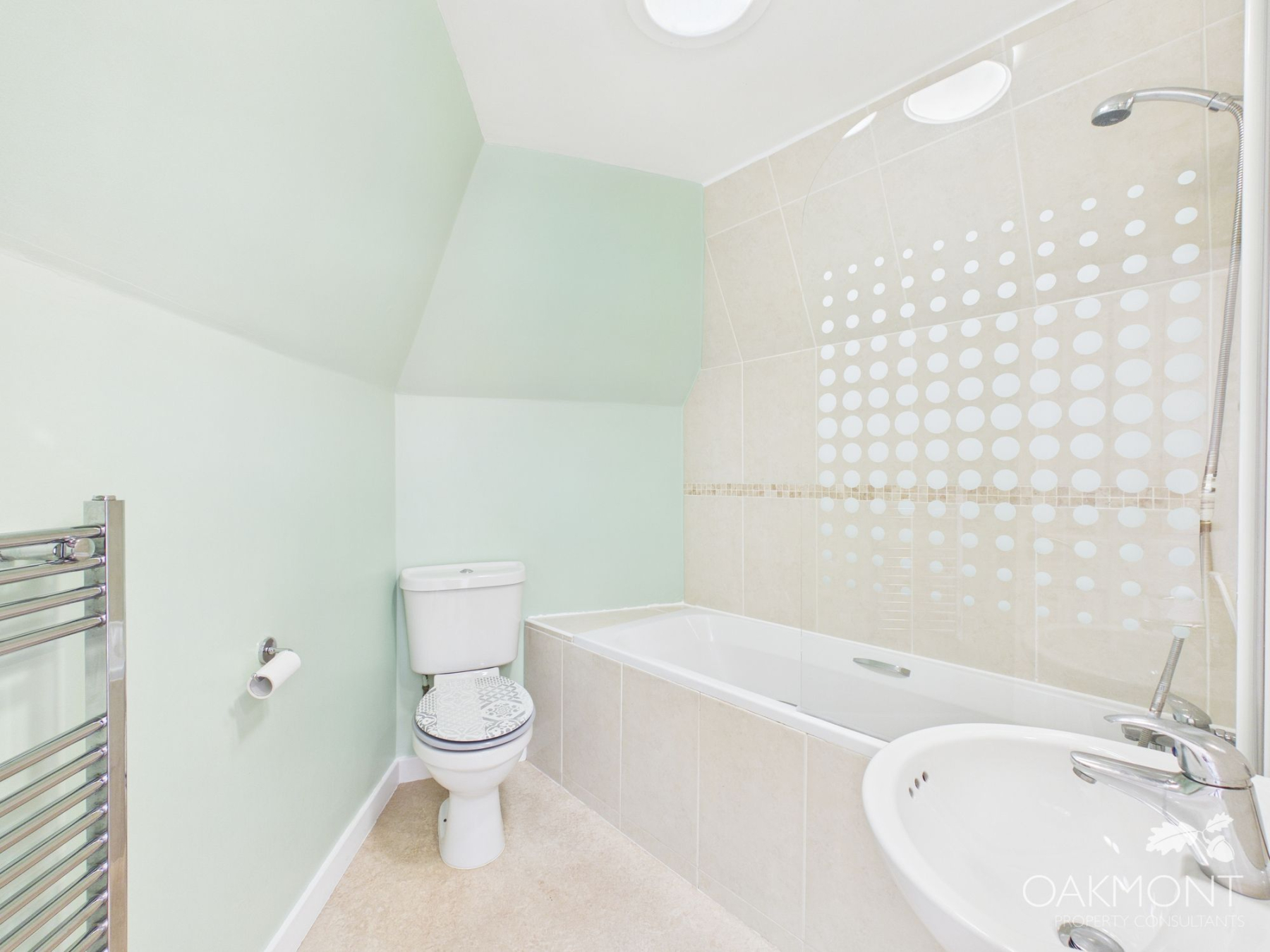 There is a good sized bedroom with skylight and window to the side and an ensuite family bathroom with bath with shower over, low level w/c and wash hand basin.