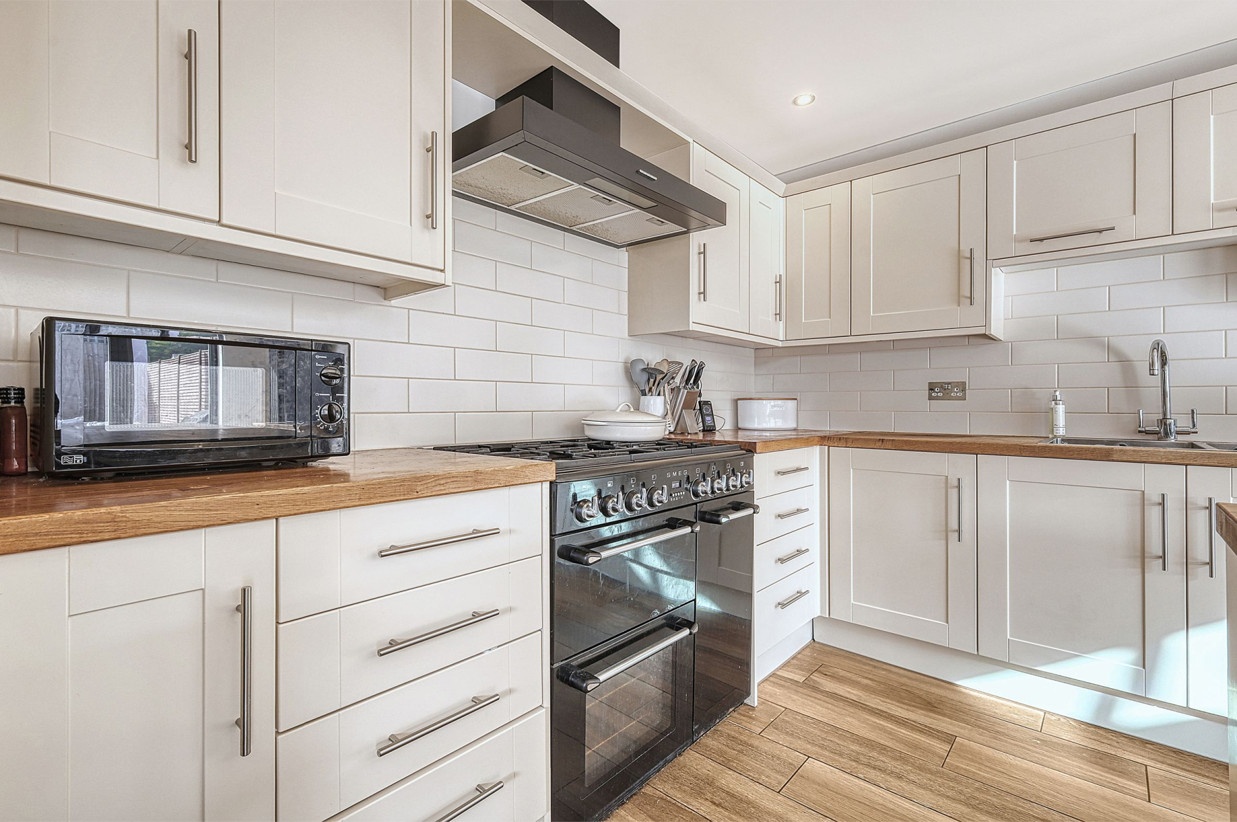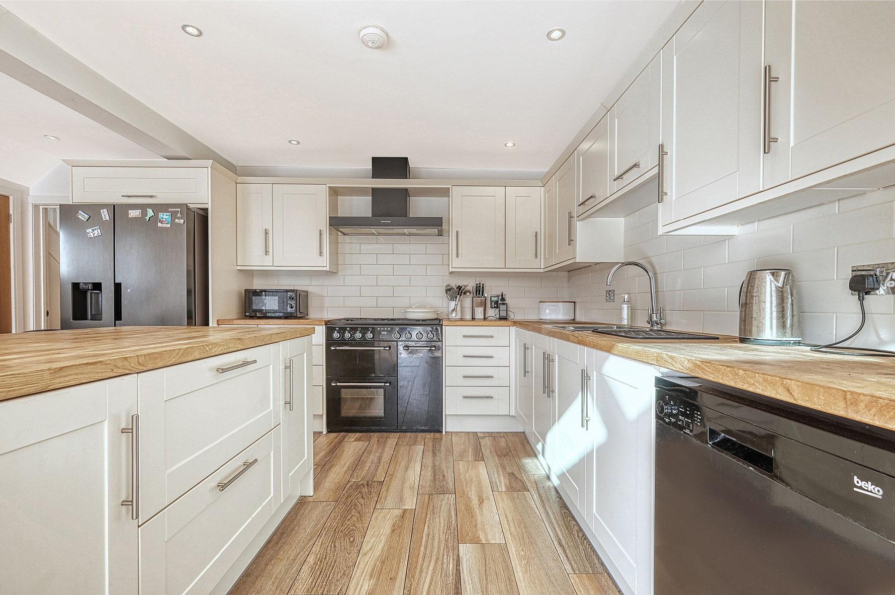 The rear extension offers the ideal open plan living space with a beautiful modern fitted kitchen. The kitchen itself has an array of base and eye level units, solid wood worktops and space for appliances including room for a free standing range cooker.